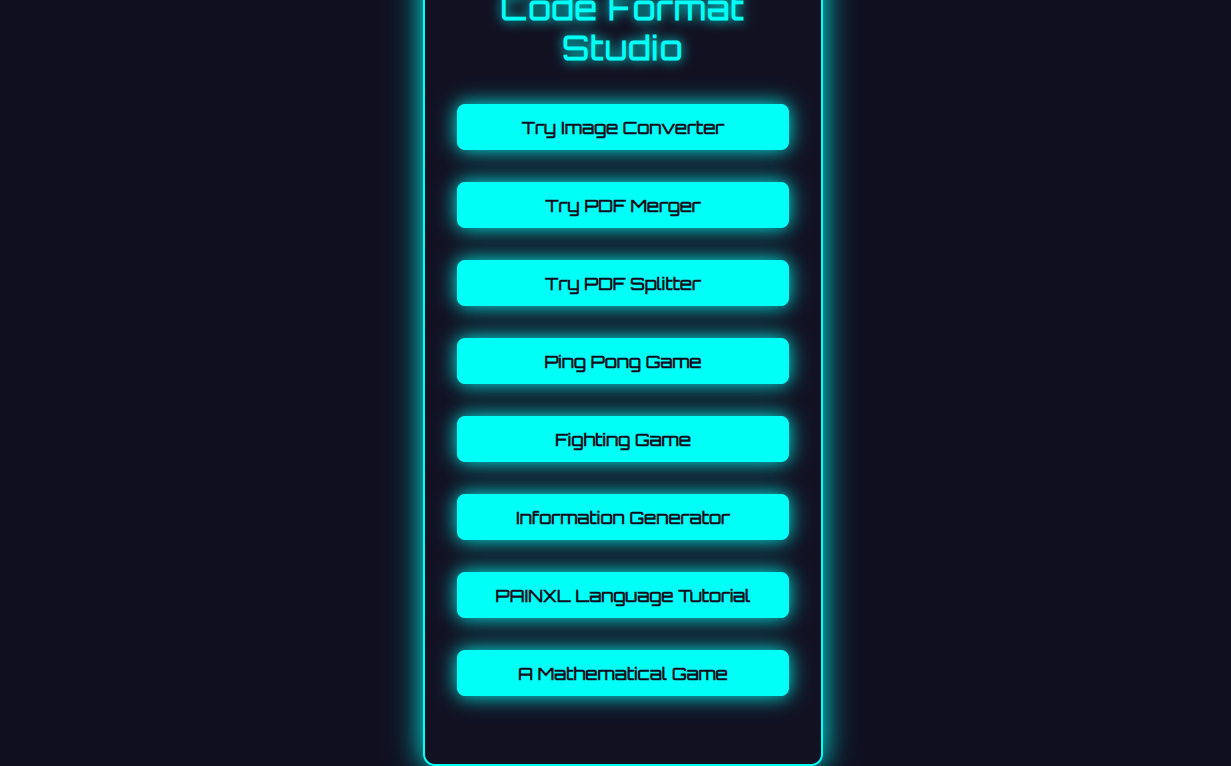 Code Format Studio is a powerful collection of online tools designed for developers, creators, and learners. It includes encoders, converters, editors, games, tutorials, and utilities — all crafted with a cyber-themed, modern user experience.